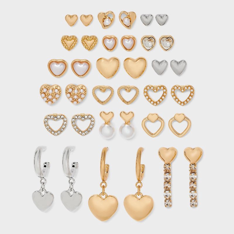 Heart multi 18-pair earring set from Wild Fable™ in silver- and gold-tone finishes. Includes a mix of studs and drop earrings with varying designs including heart shapes and charms, white faux pearls,…