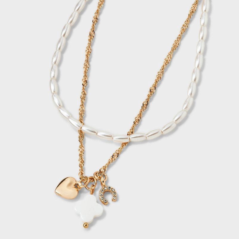 Gold- and silver-tone necklace from Wild Fable™ features faux pearls and gold-tone chain with hearts and other charms. Lobster claw clasp closure and an extender chain offer a customizable fit. Great …