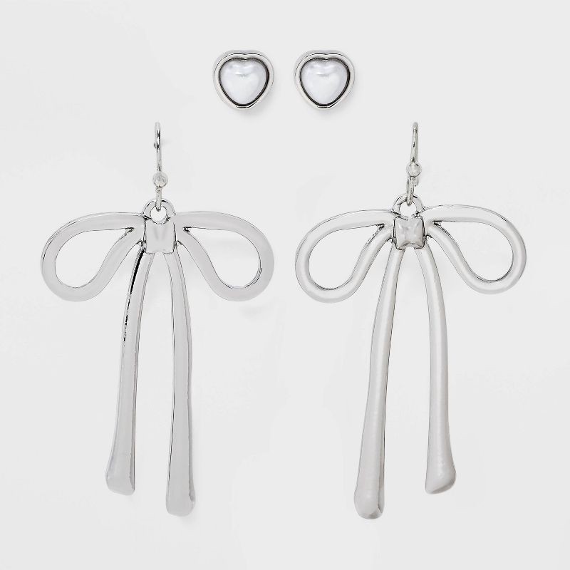 Two-piece silver-tone earring set from Wild Fable™ includes heart-shape stud and bow drop earrings. Made of nickel-free metal to suit most skin types. Postback and French wire closures offer a stay-pu…