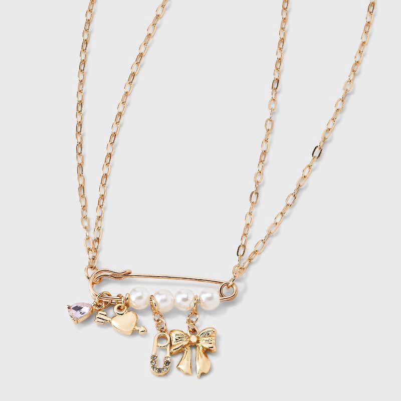Gold-tone necklace from Wild Fable™ with double chains. Features a pin with faux pearls, bow and heart charms at the center. Lobster claw clasp closure and an extender chain offer a snug, customizable…