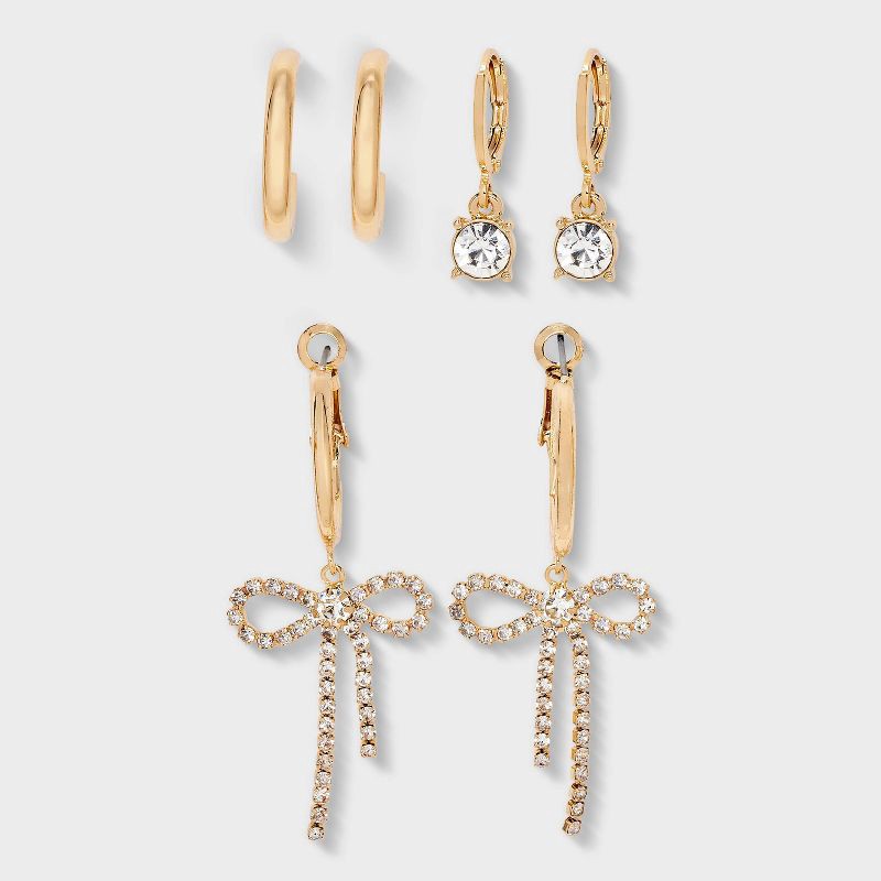Three-pair rhinestone earring set from Wild Fable™ in gold finish. Includes three pairs with different designs — one pair of simple open hoops, one hoop pair with rhinestone-studded charms and one hoo…