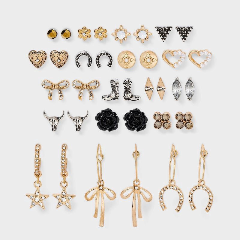Gold and silver-tone earring set from Wild Fable™ includes studs and hoop earrings. Varying designs include hearts, boots and more for everyday options. Clip-in clasp and post-back closures offer a ni…