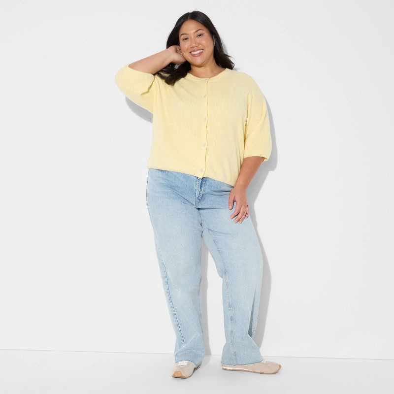 Shaker cardigan from Wild Fable™ in a solid shade. Features a crew neckline, full-length button-down front and short sleeves. Made from a midweight fabric blend of cotton, recycled polyester and nylon…