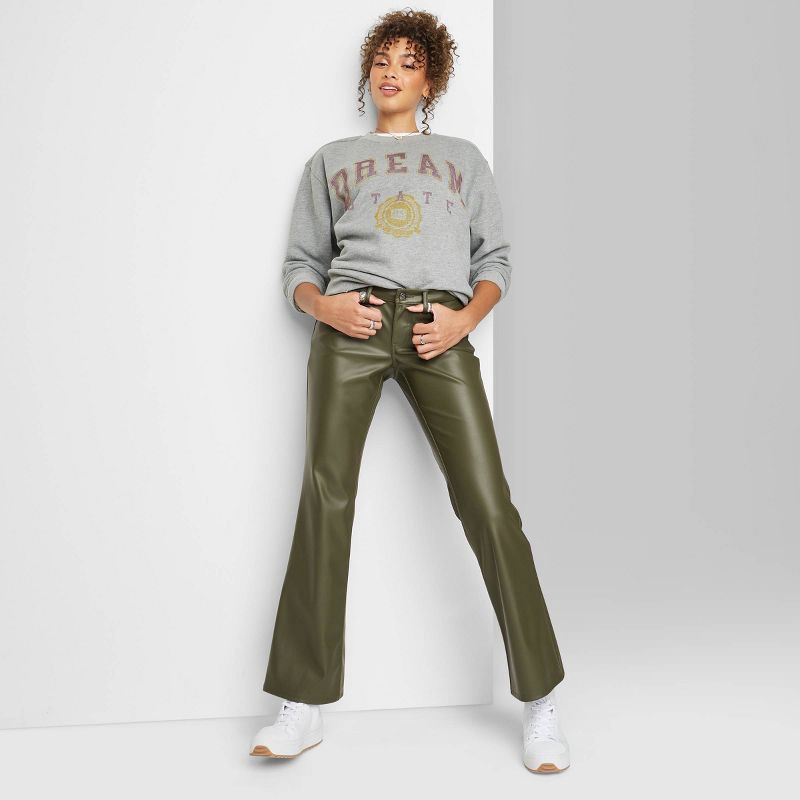 Solid-color flare pants from Wild Fable made from midweight faux leather fabric with soft lining. Feature low-rise cut and fly button and zipper closure. Side and back pockets complete the design with…