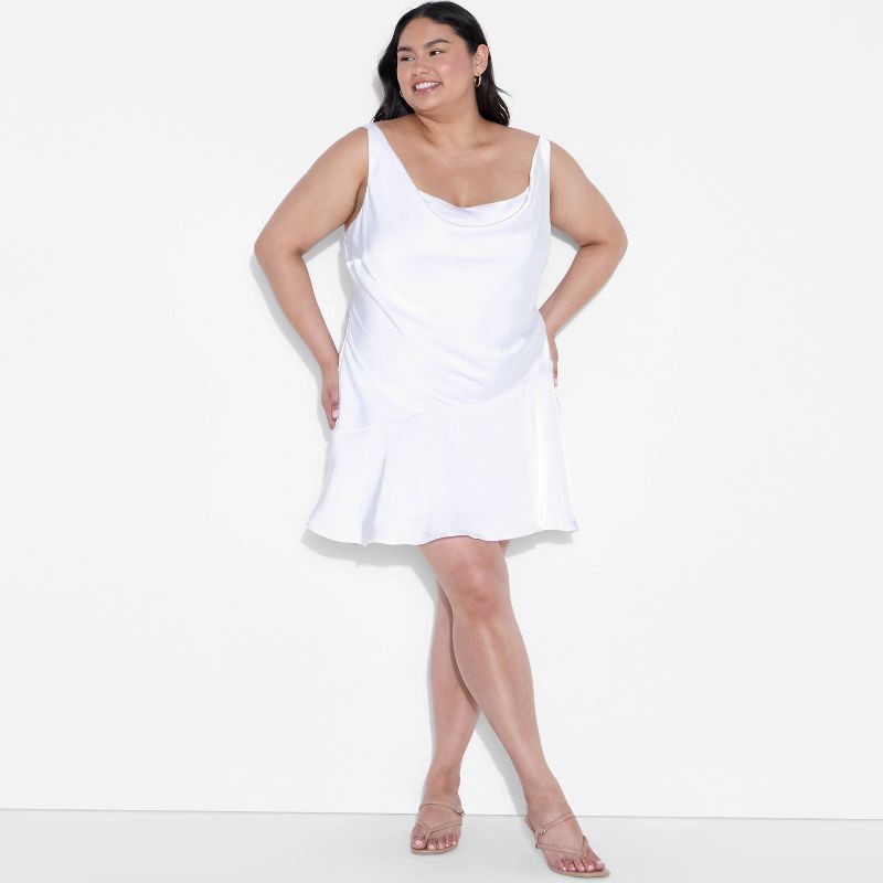 Satin sleeveless sheath dress from Wild Fable™ in a solid shade with a cowl neckline. Features adjustable shoulder straps and an asymmetrical-cut waistline. Tailored in a mini-length silhouette. Made …