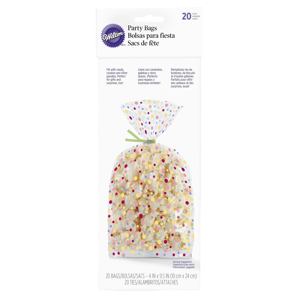 Use these festive party favor bags to hold candies, cookies, toys or other goodies for birthdays, showers and more. Clear cellophane bags are decorated with red, pink, purple, green, blue and yellow d…