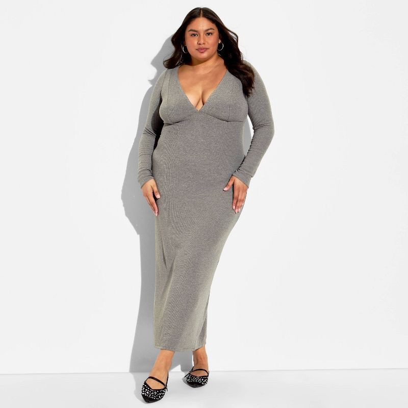 Cozy empire-waist maxi dress from Wild Fable™ in a solid shade with ribbed texture. Features a plunging V-neckline, long sleeves and a statement slit at the back. Made from a midweight recycled polyes…