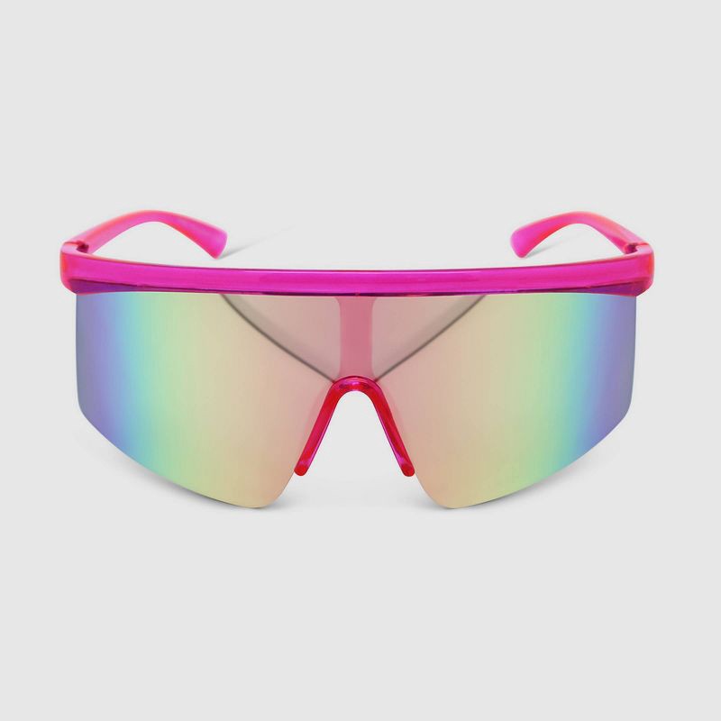 Oversized shield-style sunglasses. Made with lightweight plastic frame in a pink color with colorful lenses. UV protection lenses help shield eyes from the sun's harmful rays. Wild Fable™: A look for …