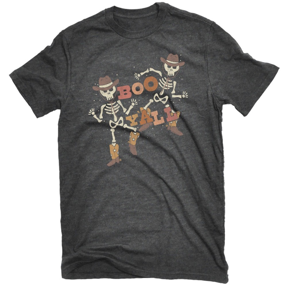 Fall themed T-shirt. 140 GSM 60/40 Cotton Polyester Jersey. FRONT CHEST BOO Y'ALL SKELETONS GRAPHIC.