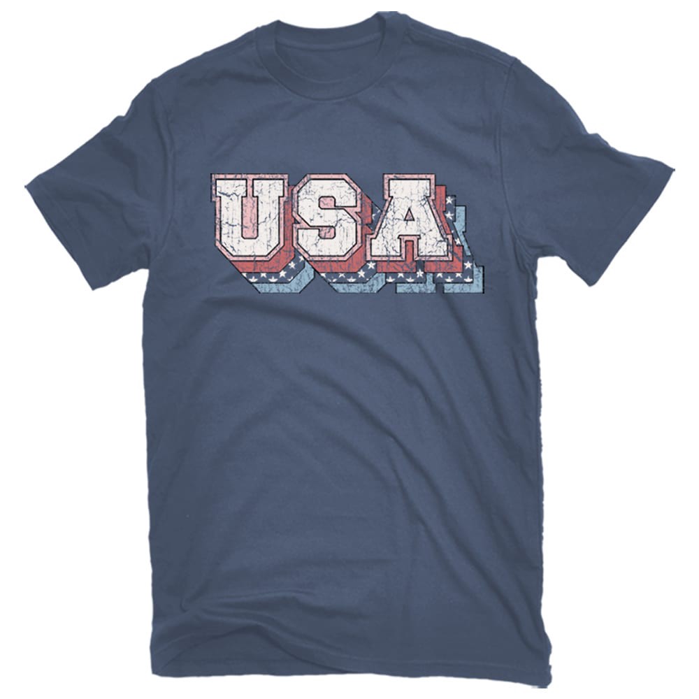 Americana themed unisex T-shirt. 140 GSM 60/40 Cotton Polyester Jersey. Front chest USA graphic.