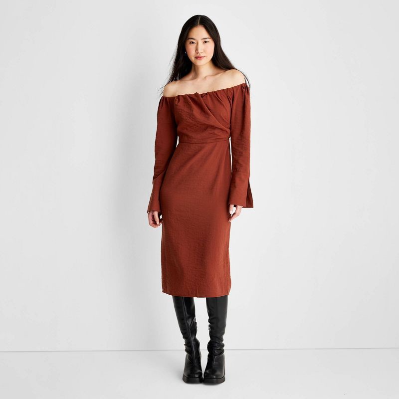 Women's Off the Shoulder Long Sleeve Midi Dress - Future Collective with Reese Blutstein Rust 2