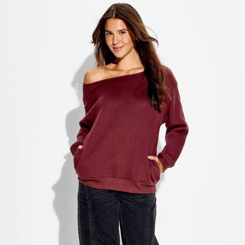 Pullover sweatshirt from Wild Fable™ with a rolled-trim off-the-shoulder neckline, dropped shoulder long sleeves and ribbed wrists and hem. Made from a midweight fleece fabric blend of cotton and recy…