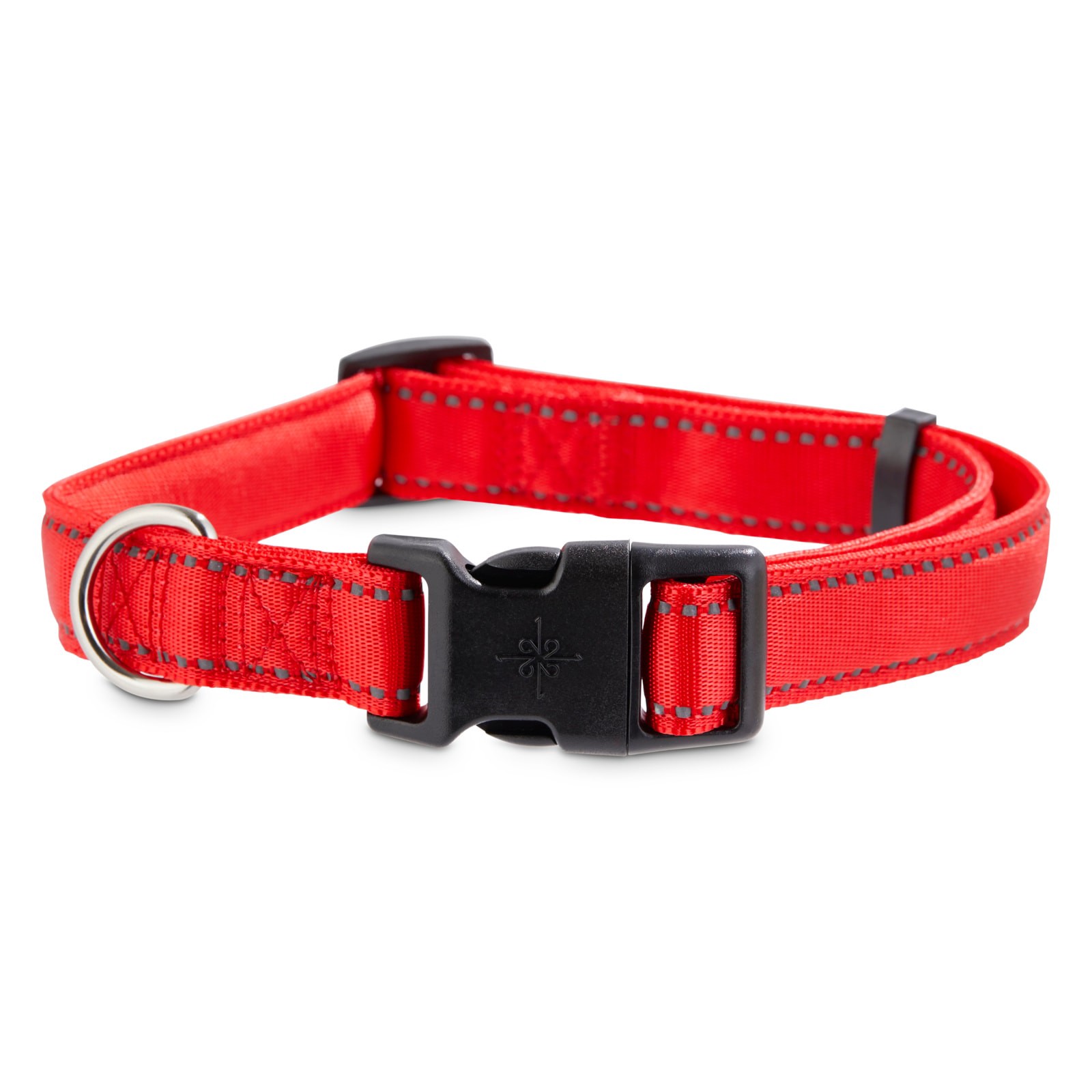 Reflective Red Dog Collar from Youly. Details reflect light for increased visibility. Heavy duty stitching adds durability for long-lasting use. Comfortable nylon construction. Metal D-ring for attach…