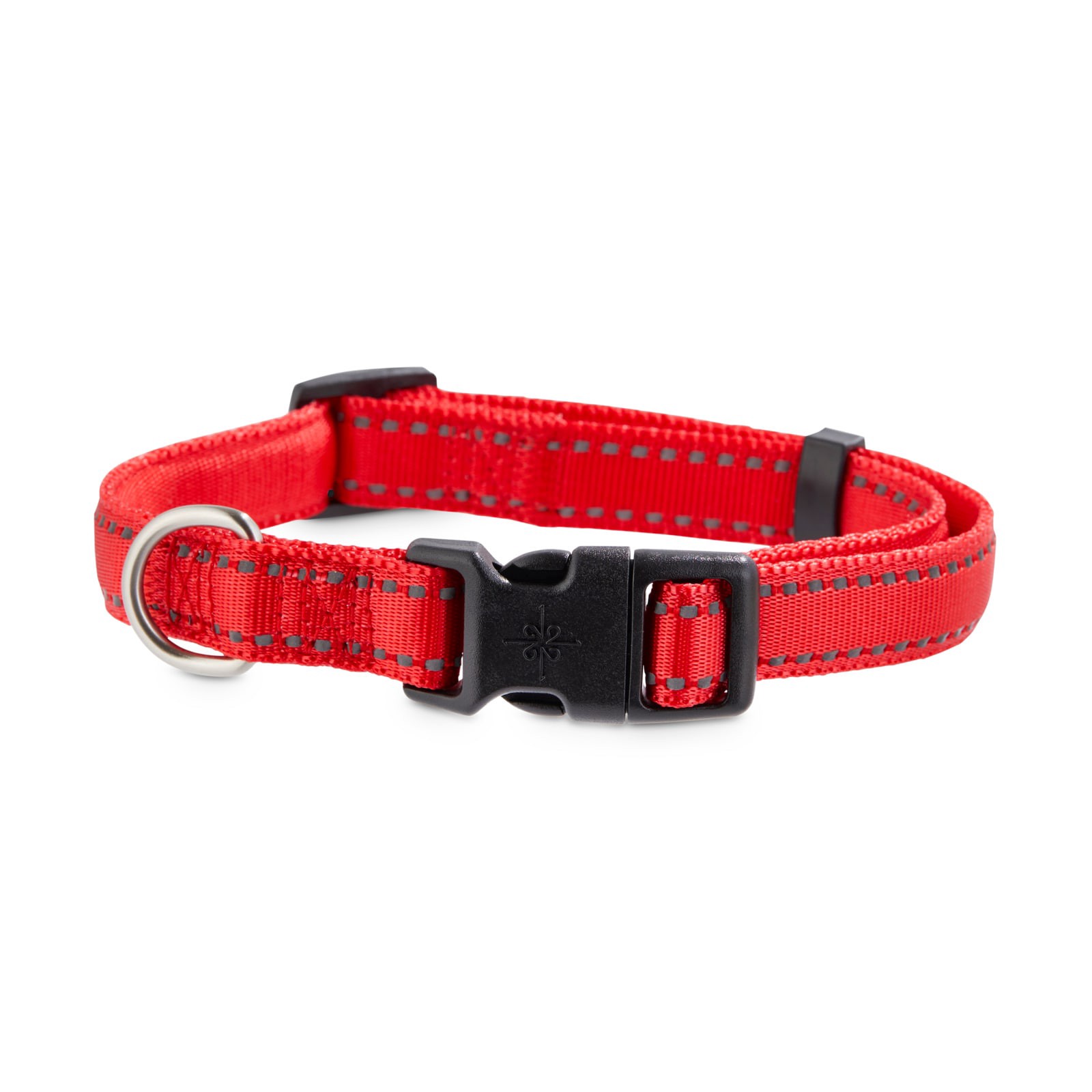 Reflective Red Dog Collar from Youly. Details reflect light for increased visibility. Heavy duty stitching adds durability for long-lasting use. Comfortable nylon construction. Metal D-ring for attach…
