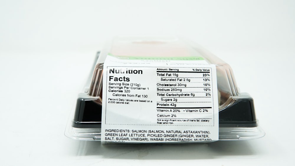 Ingredients: Salmon (Salmon, Natural Astaxanthin), Green Leaf Lettuce, Pickled Ginger (Ginger, Water, Salt, Sugar, Vinegar), Wasabi (Horseradish, Mustard, Spirulina).