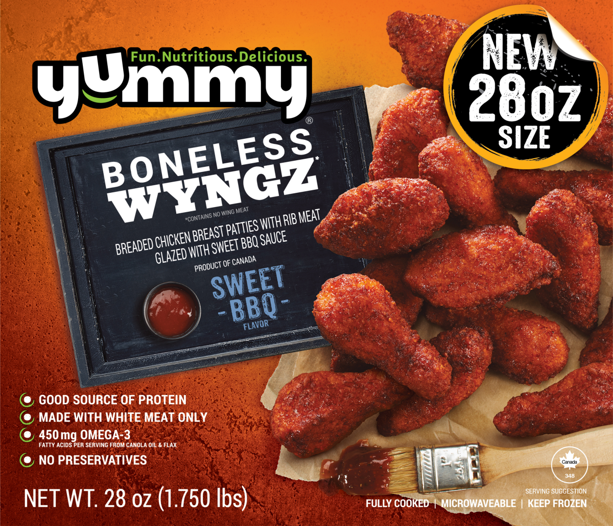 D Chicken Wing Shape Breast Patties No Bones. Lightly breaded Immersed in a Sweet Smokey BBQ Glaze.
