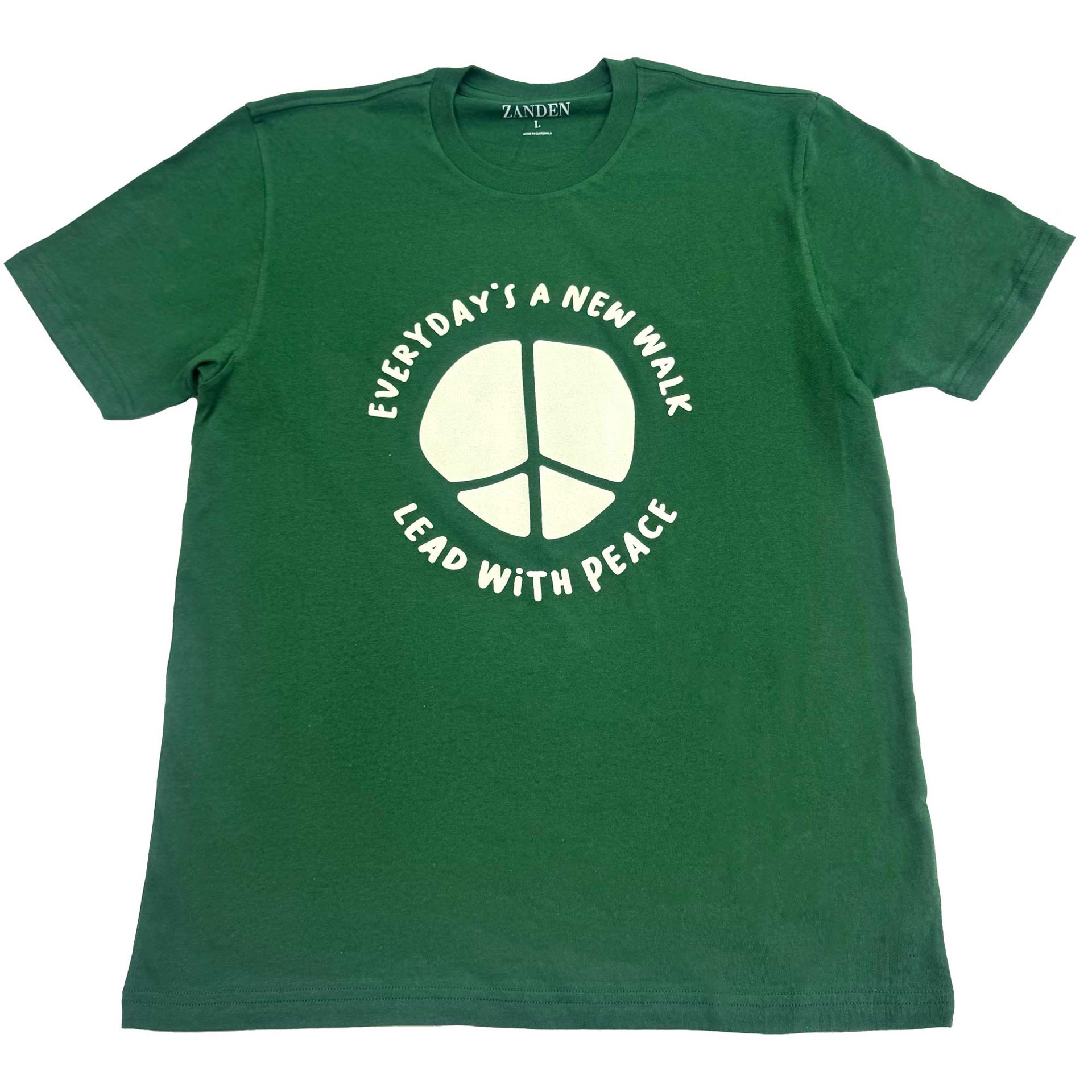 Bring good vibes to every leash loop and walking trail. This forest-green adult graphic t-shirt pairs a bold peace symbol with a reminder we can all get behind-lead with peace-on walks and in life.