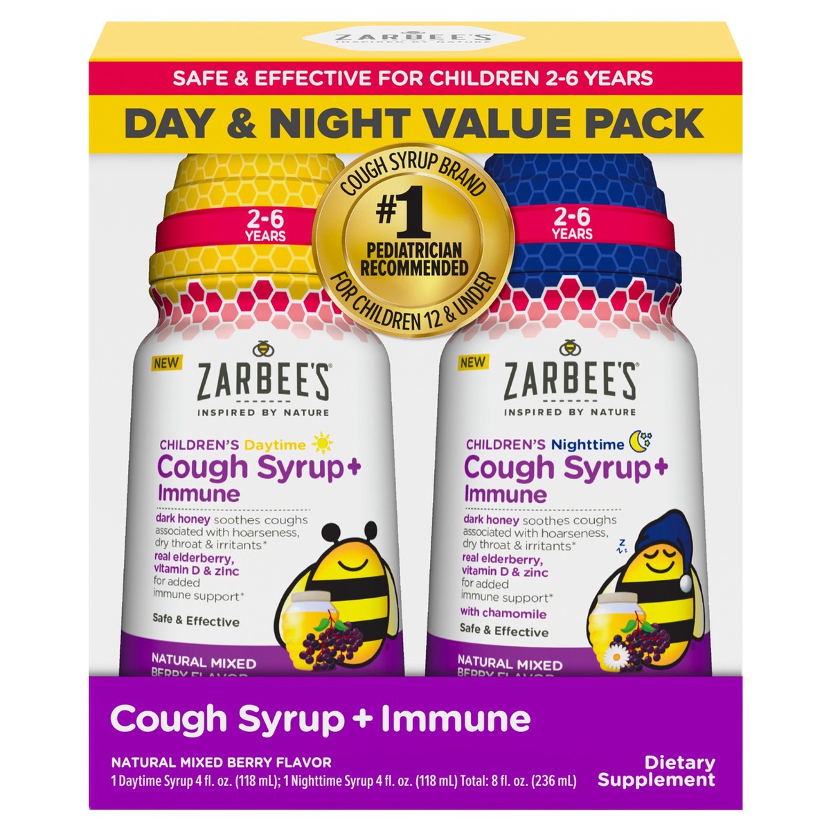 Zarbee’s Kids Cough + Immune Syrup Daytime and Nighttime Value Pack is specifically tailored for children 2-6 with carefully selected and scientifically supported ingredients like dark honey, proven t…