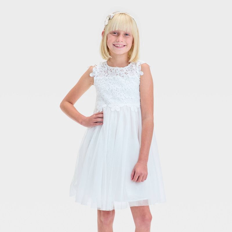 Elevate her style with this Zenzi girls' classic lace popover dress! This charming dress features a delicate lace popover bodice with cap sleeves, adding a touch of elegance to any occasion. The solid…
