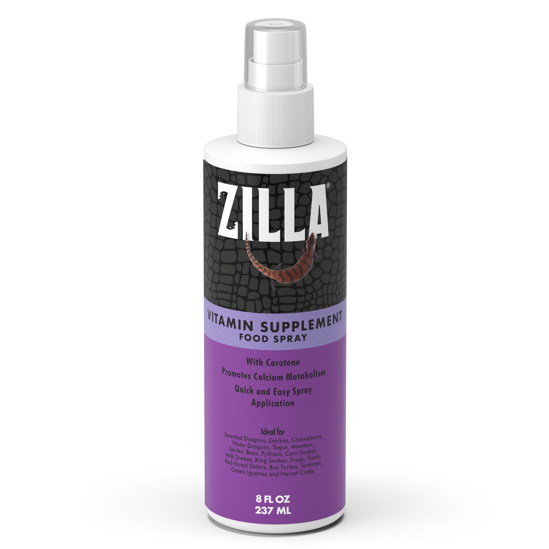 Use Zilla spray-on Vitamin Supplement by misting your reptile's food fifteen seconds before serving. The mist contains Vitamins C, B1, B2, B6, B12, D3, Niacin, Folic Acid and Vitamin A in the form of …