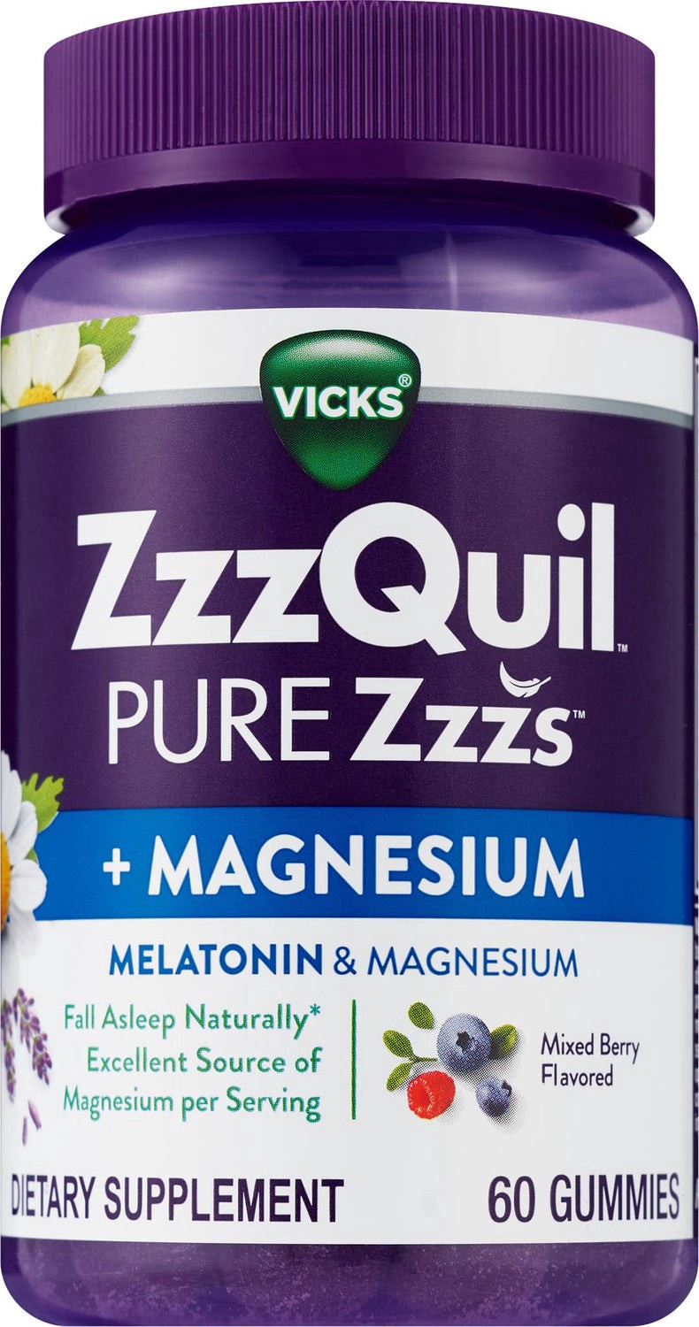 ZzzQuil PURE Zzzs +MAGNESIUM is formulated with Melatonin 2mg per serving, Magnesium Citrate, Chamomile, and Lavender. This sleep aid works naturally with your body to support your natural sleep cycle…